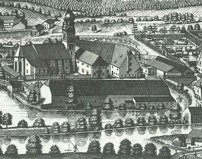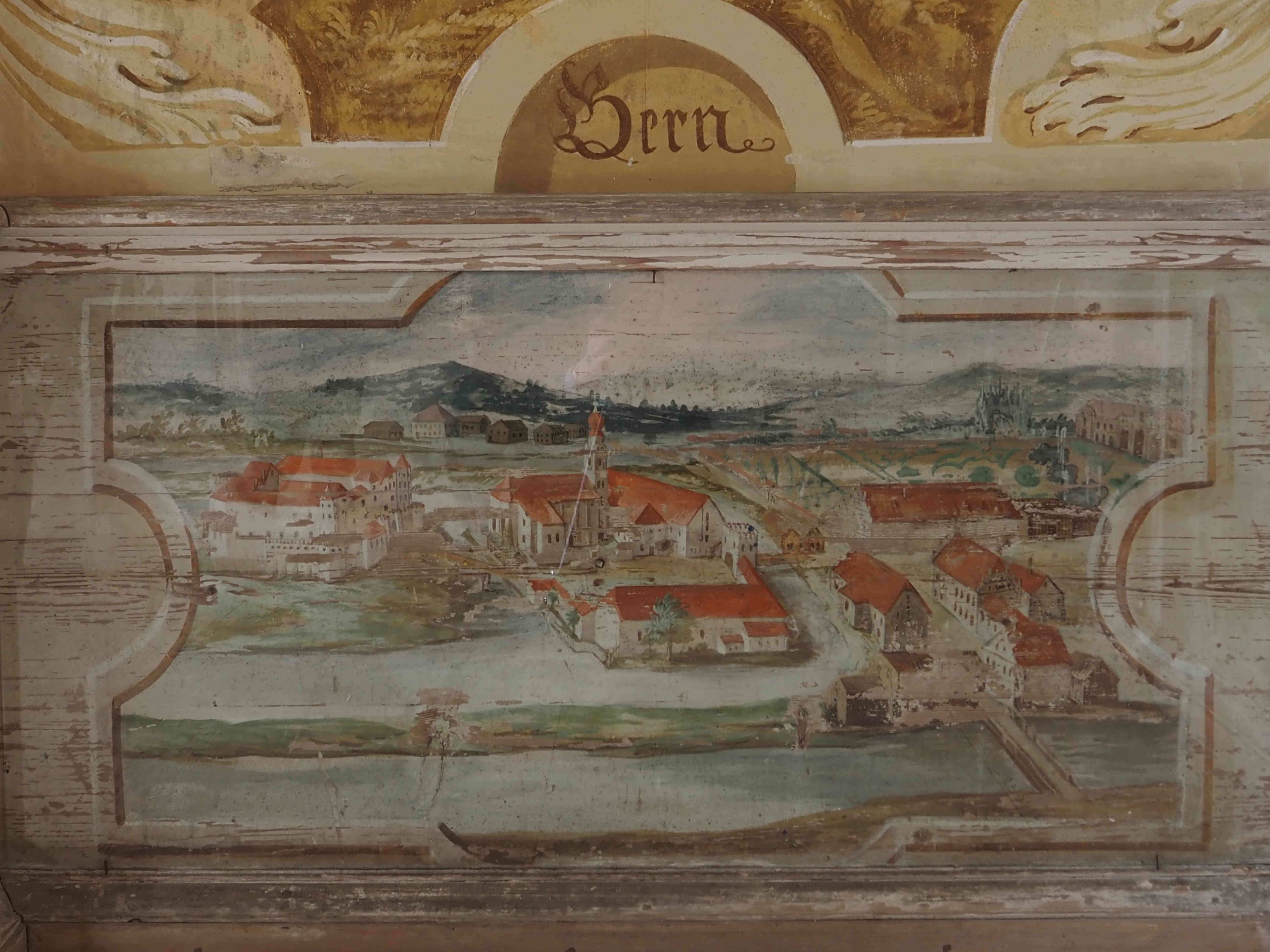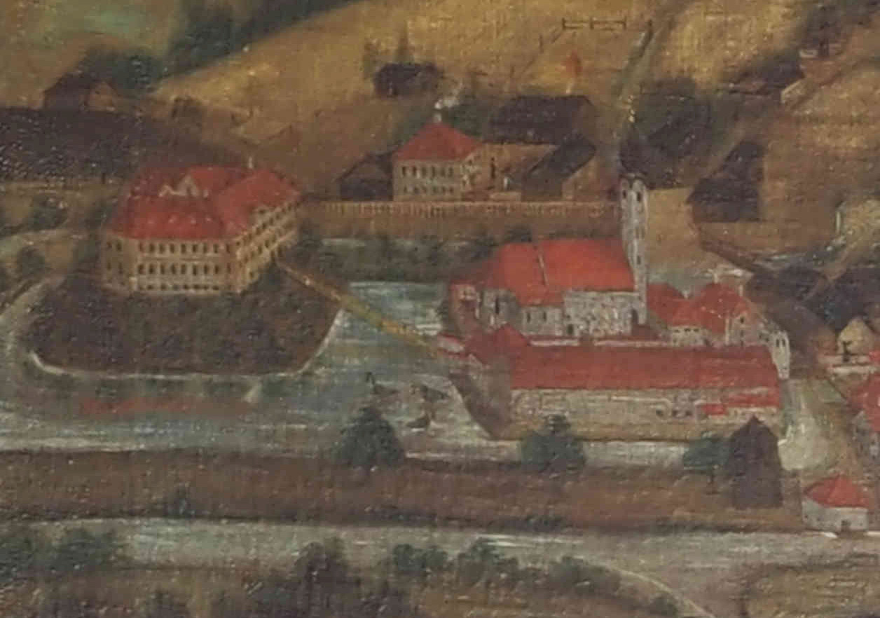 Ansicht der Hofmark Gern von Süden; deutlich erkennbar: die Inselsituationen (Leinwandgemälde, 18. Jh., Schloss Arnstorf).