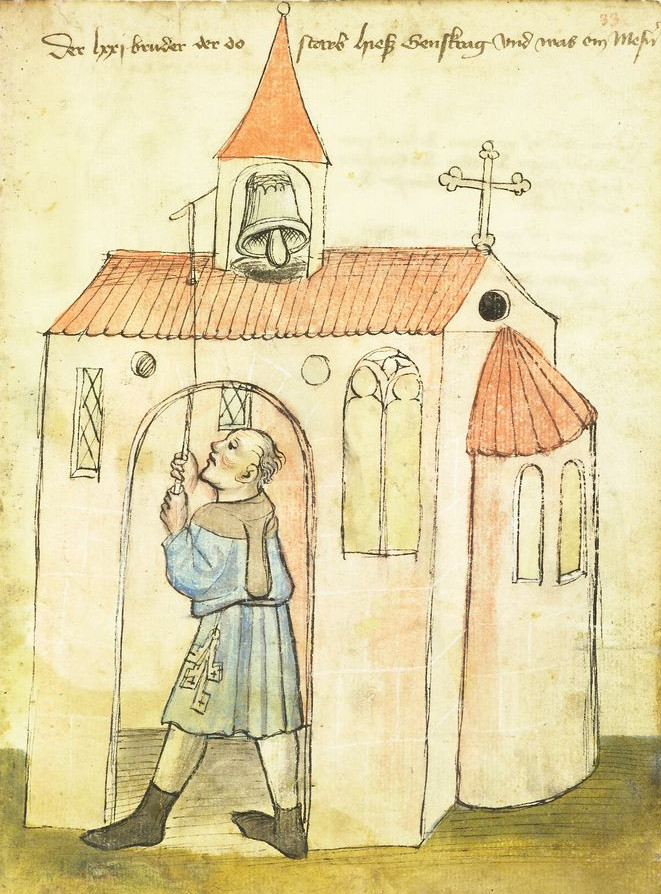 Bruder Genskrag, auch Mitglied der Zwöfbrüderstiftung und Mesner von Beruf, gab dagegen akustische Signale mit Glocken: "[er] steht im offenen Eingang einer kleinen Kirche und zieht am Glockenseil, das durch das Dach über eine Stange zum Dachreiter mit der Glocke geführt wird. (...)"