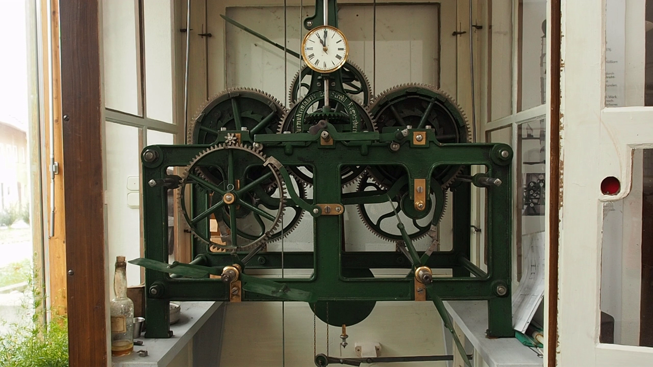 Am Aufbau und Betrieb des musealisierten Turmuhrwerks lassen sich mechanische Funktionen aufzeigen, deren Prinzip auch ältere Uhren folgen.