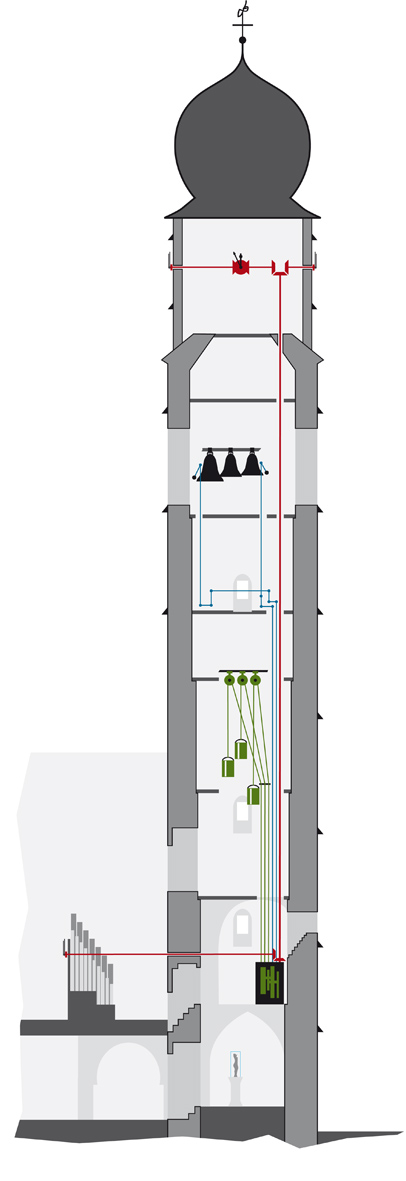 Beide Glockenschläge des Stundengeläuts werden jeweils über Zugdrähte ausgelöst, die vom Uhrwerk zum Glockenstuhl (mit zusätzlichem Kontrollzifferblatt) hinaufreichen.