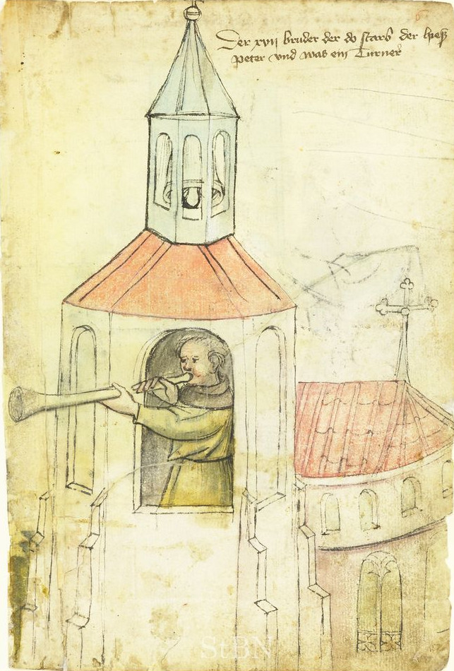 Der Eintrag für den Türmer Bruder Peter aus den Nürnberger Hausbüchern der Zwölfbrüderstiftung (entstanden um 1425) wird so beschrieben: "[er] steht in der offenen Turmkammer und bläst mit der Busine das Stundensignal. Bekrönt wird der Turm von einem kleinen Dachreiter, in dem eine Glocke hängt. (...)"